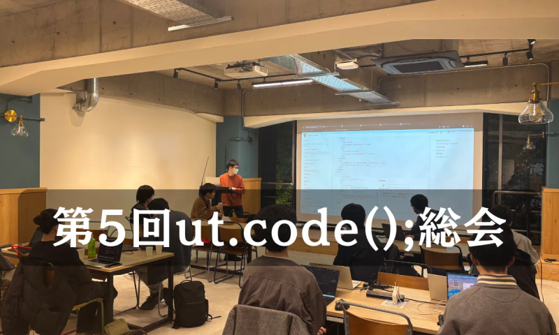 ut.code(); では、11 月 29 日に第 5 回 ut.code(); 総会を行いました。 常設プロジェクトからの発表 まずは、年間を通して活動している常設プロジェクトからの発表を行いました。 新たに追加された機能の紹介や、今後の展望の共有、制作したアプリのデモなどを通して、互いに刺激を受ける機会となりました。 shenさんの発表 touchdesigner-vjの発表 プロジェクト発足会に向けて・アイデアソン 続けて、12 月 13 日に行われるプロジェクト発足会に向けて、アイデアソンを行いました。 プロジェクト発足会とは? プロジェクト発足会は、ut.code();...